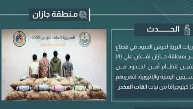 قبضت الدوريات البرية لحرس الحدود في قطاع الدائر بمنطقة جازان، على (4) مخالفين لنظام أمن الحدود من الجنسيتين اليمنية والإثيوبية،…