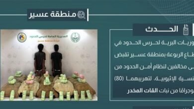 حرس الحدود بمنطقة عسير يقبض على مخالفين لتهريبهما (80) كيلوجرامًا من نبات القات المخدر