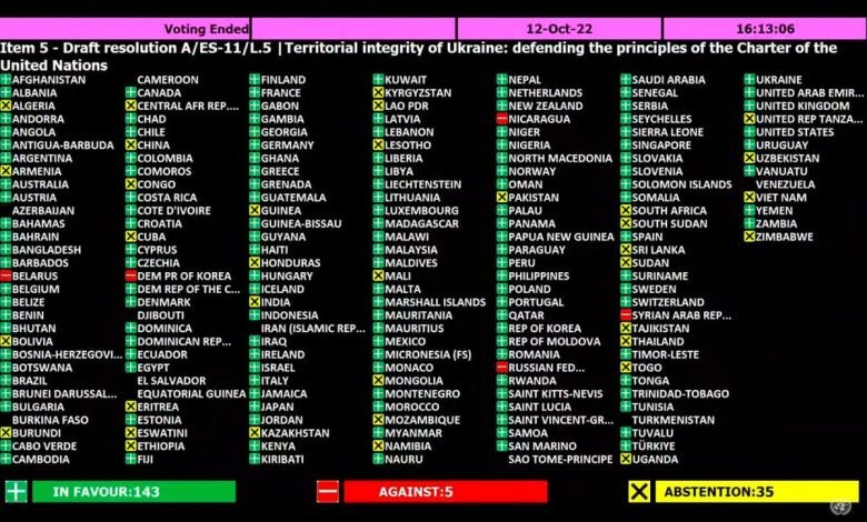 ويدين القرار “تنظيم روسيا الاتحادية استفتاءات مزعومة داخل حدود أوكرانيا المعترف بها دولياً” و”محاولة الضم غير القانوني” التي أعلنها الرئيس فلاديمير بوتين في الشهر الماضي لأربع مناطق أوكرانية.