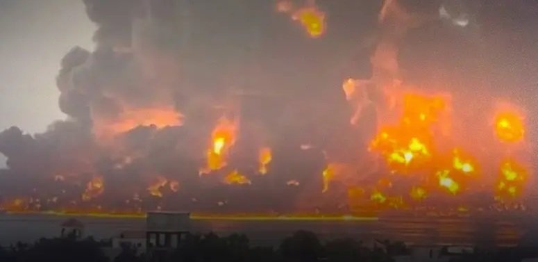 فقد اندلعت النيران من الميناء، واشتعلت فيه وسط تصاعد أعمدة الدخان بعد اتساع ألسنة اللهب.