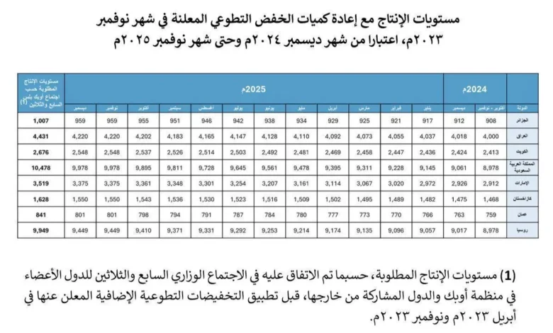 مستويات الإنتاج مع إعادة كميات الخفض التطوعي المعلنة في شهر نوفمبر 2023م، اعتباراً من شهر ديسمبر 2024م وحتى شهر نوفمبر 2025م