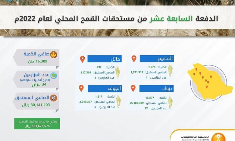 أعلنت المؤسسة العامة للحبوب عن صرف مستحقات الدفعة السابعة عشر من مزارعي القمح المحلي، للذين قاموا بتوريد الكميات المخصصة لهم لهذا الموسم 1443 / 1444هـ، وإغلاق الحسابات عبر المنصة الإلكترونية “محصولي” على الموقع الرسمي للمؤسسة.
