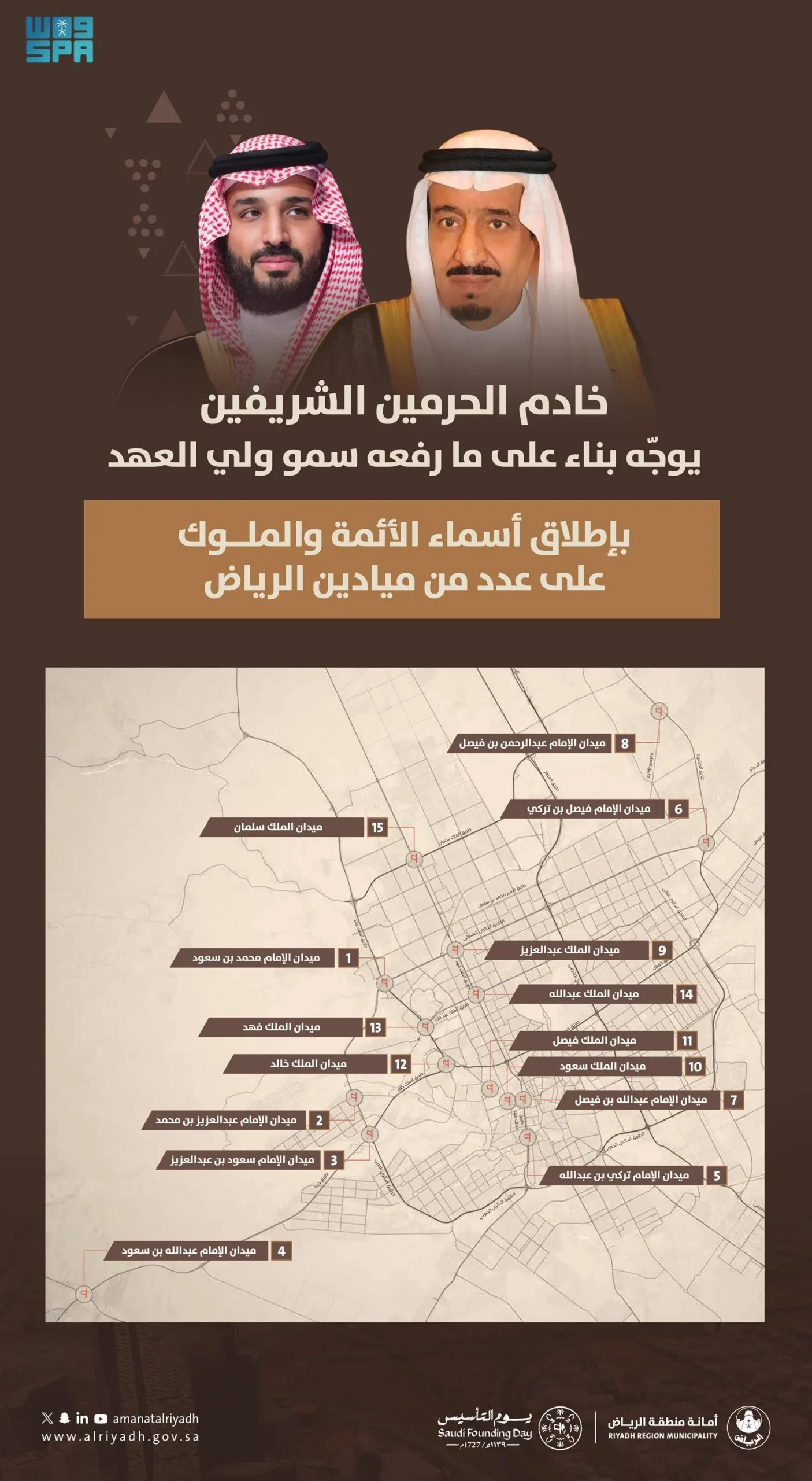 تخليدًا لذكرى أئمة وملوك الدولة السعودية؛ وجه خادم الحرمين الشريفين الملك سلمان بن عبدالعزيز آل سعود -أيده الله- بناءً على ما رفعه صاحب السمو الملكي الأمير محمد بن سلمان بن عبدالعزيز آل سعود ولي العهد رئيس مجلس الوزراء -حفظه الله- بإطلاق أسماء أئمة وملوك الدولة على 15 ميدانًا بمدينة الرياض، وذلك تزامنًا مع احتفاء المملكة العربية السعودية بيوم التأسيس الذي يوافق 22 فبراير من كل عام.