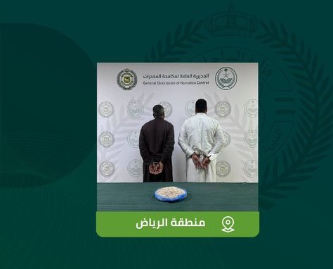 قبضت المديرية العامة لمكافحة المخدرات على مقيمين من الجنسية السورية بمنطقة الرياض لترويجهما (11,598) قرصًا من مادة الإمفيتامين المخدر، وجرى إيقافهما واتخاذ الإجراءات النظامية بحقهما، وإحالتهما إلى النيابة العامة.