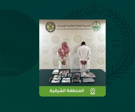 قبضت المديرية العامة لمكافحة المخدرات على مواطنين بالمنطقة الشرقية لترويجهما (6) كيلوجرامات من مادة الحشيش المخدر، وجرى إيقافهما واتخاذ الإجراءات النظامية بحقهما، وإحالتهما إلى النيابة العامة.