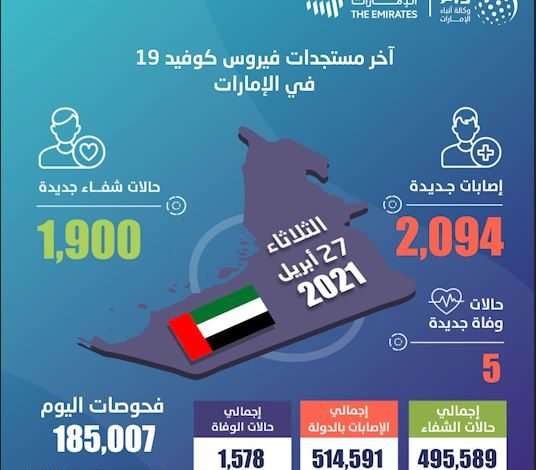 الإمارات تكشف عن 2094 إصابة جديدة بفيروس كورونا و1900 حالة شفاء و5 حالات وفاة