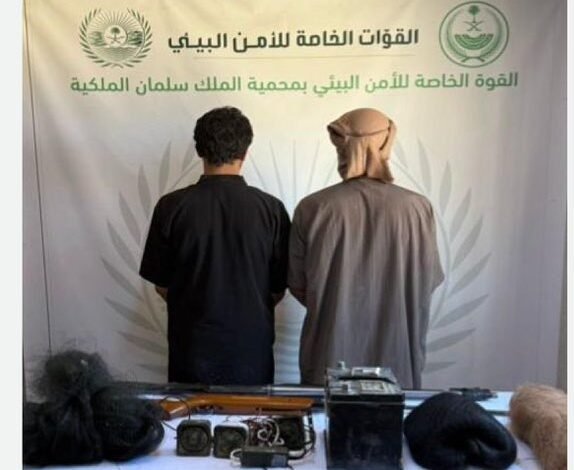 ضبطت دوريات القوات الخاصة للأمن البيئي مواطنين مخالفين لنظام البيئة لارتكابهما مخالفة الشروع في الصيد دون ترخيص في محمية الملك سلمان الملكية، بحوزتهما بندقية شوزن وبندقية هوائية وجهاز جذب الطيور و(3) شباك صيد، وطُبقت الإجراءات النظامية بحقهما.