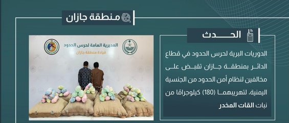 قبضت الدوريات البرية لحرس الحدود في قطاع الدائر بمنطقة جازان على مخالفين لنظام أمن الحدود من الجنسية اليمنية، لتهريبهما (180) كيلوجرامًا من نبات القات المخدر، واستكملت الإجراءات النظامية الأولية بحقهما، وسُلّما والمضبوطات لجهة الاختصاص.