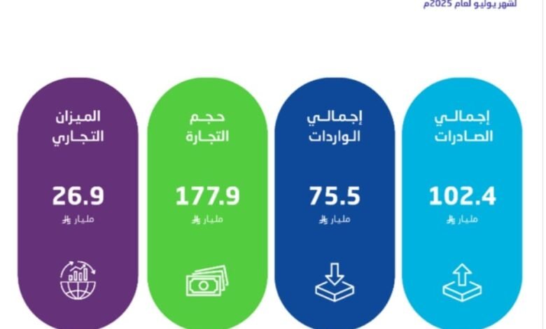 وأوضحت النتائج أن الصادرات البترولية انخفضت بنسبة (0.7%) خلال الفترة نفسها، لتتراجع نسبتها من إجمالي الصادرات السلعية من (72.8%) في يوليو 2024م إلى (67.1%) في يوليو 2025م, وعلى صعيد الميزان التجاري ارتفع الفائض بنسبة (53.4%) مقارنةً بشهر يوليو 2024م، مدفوعًا بانخفاض الواردات بنسبة (2.5%).