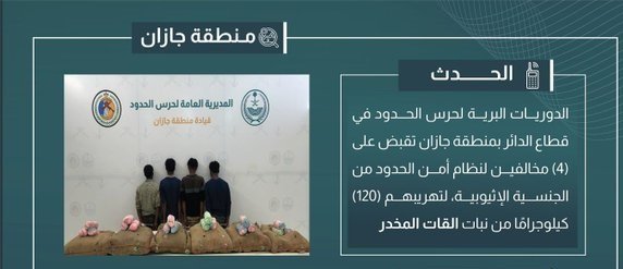 قبضت الدوريات البرية لحرس الحدود في قطاع الدائر بمنطقة جازان على (4) مخالفين لنظام أمن الحدود من الجنسية الإثيوبية، لتهريبهم (120) كيلوجرامًا من نبات القات المخدر، واستكملت الإجراءات النظامية الأولية بحقهم، وسلّموا والمضبوطات لجهة الاختصاص.