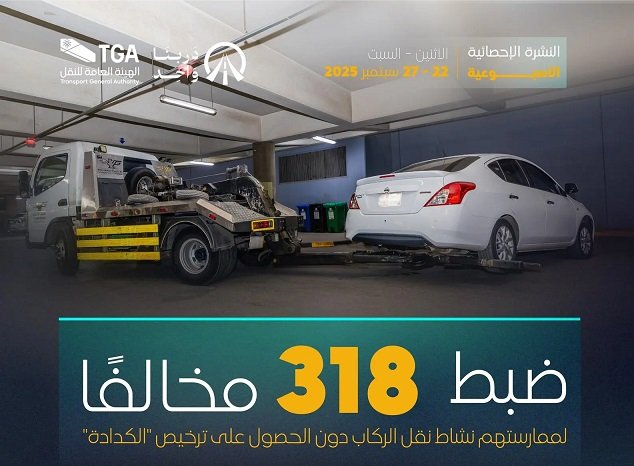 واصلت الفرق الرقابية في الهيئة العامة للنقل جولاتها التفتيشية، وضبطت خلال الفترة من الاثنين حتى السبت الموافق (22 – 27) سبتمبر الجاري، (318) مخالفًا، أوقعت بحقهم الإجراءات النظامية التي تتضمن حجز المركبات وغرامات مالية؛ لممارستهم نشاط نقل الركاب دون الحصول على ترخيص “الكدادة”، وذلك في مختلف مناطق المملكة، بالتعاون مع عدد من الجهات المعنية.
