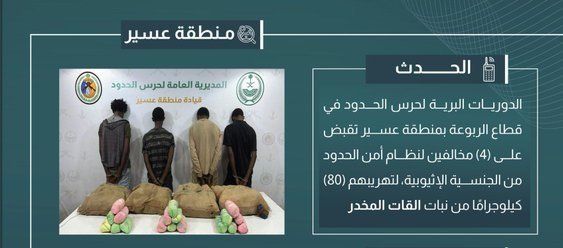 قبضت الدوريات البرية لحرس الحدود في قطاع الربوعة بمنطقة عسير على (4) مخالفين لنظام أمن الحدود من الجنسية الإثيوبية، لتهريبهم (80) كيلوجرامًا من نبات القات المخدر، واستكملت الإجراءات النظامية الأولية بحقهم، وسلموا والمضبوطات لجهة الاختصاص.