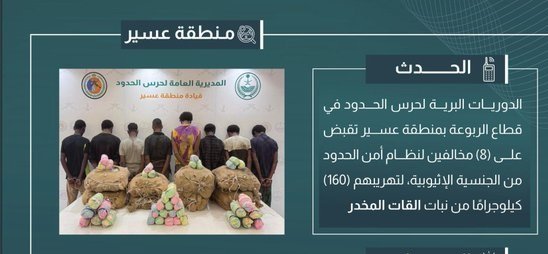 قبضت الدوريات البرية لحرس الحدود في قطاع الربوعة بمنطقة عسير، على (8) مخالفين لنظام أمن الحدود من الجنسية الإثيوبية، لتهريبهم (160) كيلوجرامًا من نبات القات المخدر، واستكملت الإجراءات النظامية الأولية بحقهم، وسلموا لجهة الاختصاص.