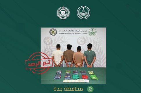 مكافحة المخدرات تقبض على (4) مقيمين بمحافظة جدة لترويجهم (11) كيلوجرامًا من مادة الحشيش المخدر