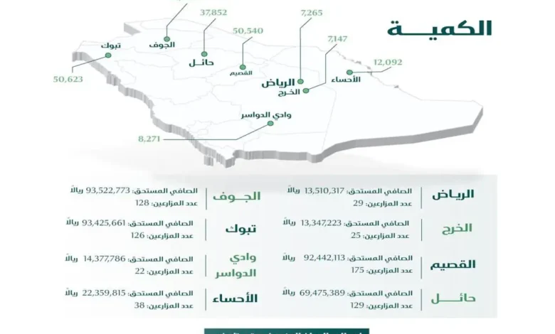 وبلغ إجمالي ما تم إيداعه في حسابات المزارعين البنكية لهذه الدفعة مبلغ (412,461,077) ريالًا، لصافي كمية مستلمة (226,452) طنًا، لعدد (672) مزارعًا، ليبلغ إجمالي ما تم صرفه هذا الموسم مبلغ (1,402,038,522) ريالًا، وذلك لكمية (781,843) طنًا، لعدد (2672) مزارعًا.