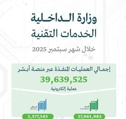 نفذت منصة وزارة الداخلية الإلكترونية “أبشر”، خلال شهر سبتمبر الماضي (39,639,525) عملية إلكترونية، للمستفيدين عبر أبشر أفراد وأعمال.