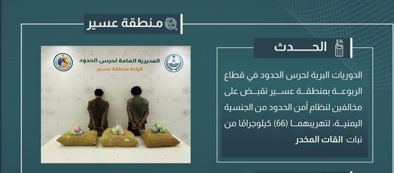 قبضت الدوريات البرية لحرس الحدود في قطاع الربوعة بمنطقة عسير، على مخالفين لنظام أمن الحدود من الجنسية اليمنية، لتهريبهما (66) كيلوجرامًا من نبات القات المخدر، واستكملت بحقهما الإجراءات النظامية الأولية وتسليمهما والمضبوطات لجهة الاختصاص.