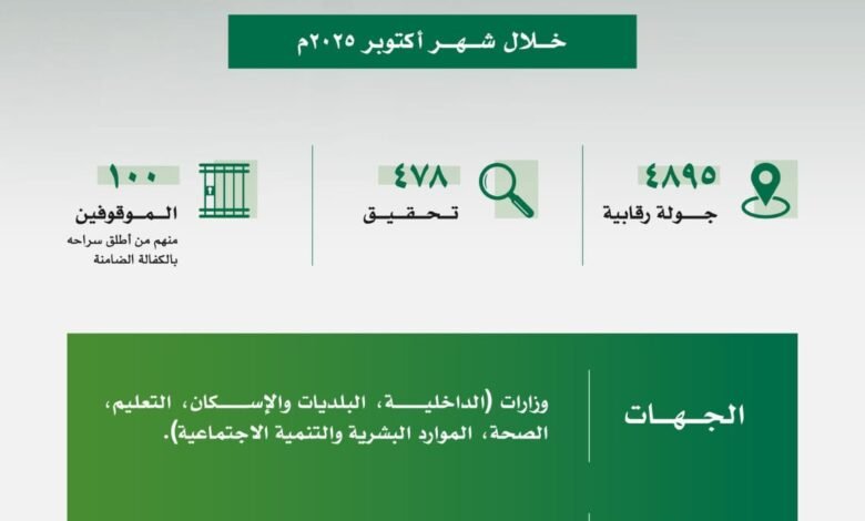 باشرت هيئة الرقابة ومكافحة الفساد «نزاهة» خلال شهر أكتوبر 2025، اختصاصاتها ومهامها من خلال عمل (4895) جولة رقابية، والتحقيق مع (478) مشتبها به من ضمنهم موظفون من وزارات (الداخلية، البلديات والإسكان، التعليم، الصحة، الموارد البشرية والتنمية الاجتماعية)، وإيقاف (100) مواطن ومقيم، وفقاً لنظام الإجراءات الجزائية منهم من أطلق سراحه بالكفالة الضامنة، لتورطهم بتهم (الرشوة، استغلال النفوذ الوظيفي). وجارٍ استكمال الإجراءات النظامية تمهيداً لإحالتهم للقضاء.