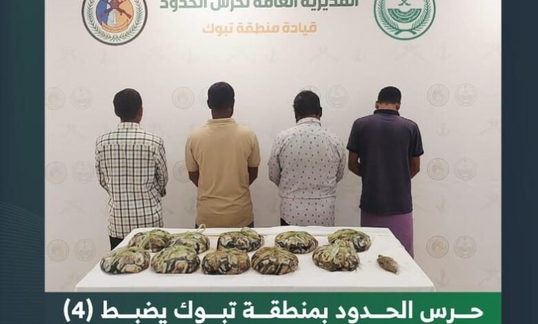 ضبطت الدوريات الساحلية لحرس الحدود في محافظة أملج بمنطقة تبوك (4) مقيمين من الجنسية البنجلاديشية مخالفين للائحة الأمن والسلامة لمزاولي الأنشطة البحرية في المناطق البحرية للمملكة العربية السعودية، وذلك لممارستهم الصيد دون تصريح، وبحوزتهم أسماك مصيدة، وتم اتخاذ الإجراءات النظامية بحقهم بالتنسيق مع الجهات المختصة.