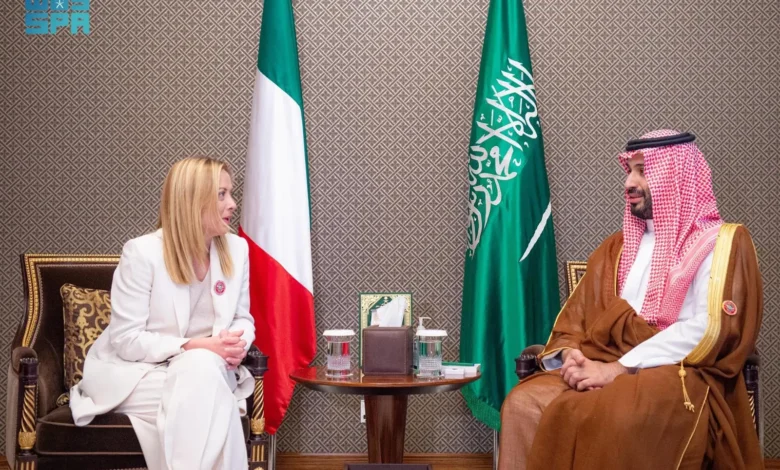 التقى صاحب السمو الملكي الأمير محمد بن سلمان بن عبدالعزيز آل سعود ولي العهد رئيس مجلس الوزراء، في العاصمة البحرينية المنامة اليوم، دولة السيدة جورجيا ميلوني رئيسة وزراء جمهورية إيطاليا، وذلك على هامش أعمال الدورة الـ 46 للمجلس الأعلى لمجلس التعاون لدول الخليج العربية.