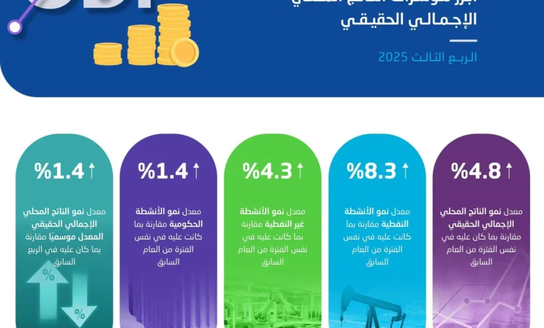 حقق الناتج المحلي الإجمالي الحقيقي للربع الثالث من عام 2025م نموًا بنسبة 4.8% مقارنةً بما كان عليه في نفس الفترة من عام 2024.