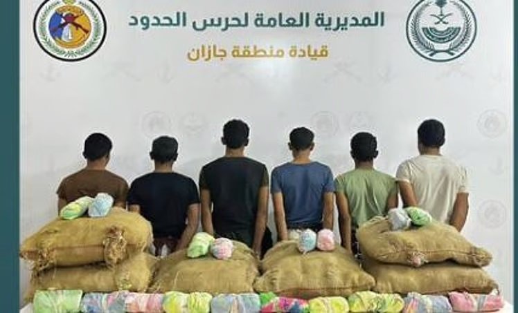 ألقت الدوريات البرية لحرس الحدود في قطاع العارضة، بمنطقة جازان، القبض على 6 مخالفين لنظام أمن الحدود من الجنسية اليمنية، لتهريبهم 90 كيلوجراما من نبات القات المخدر. وجرى استكمال الإجراءات النظامية الأولية بحقهم، وتسليمهم والمضبوطات لجهة الاختصاص.