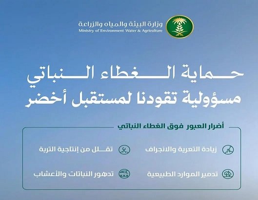 حثَّت وزارة البيئة والمياه والزراعة على تجنب العبور العشوائي بالمركبات فوق الغطاء النباتي خلال التنزهات في موسم الشتاء، حيث يعد أحد أبرز العوامل المسببة لتدهور المناطق البرية في المملكة.