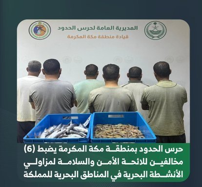 ضبطت الدوريات الساحلية لحرس الحدود في محافظة القنفذة بمنطقة مكة المكرمة (6) مقيمين من الجنسية المصرية مخالفين للائحة الأمن والسلامة لمزاولي الأنشطة البحرية في المناطق البحرية للمملكة العربية السعودية؛ وذلك لممارستهم الصيد دون تصريح، وبحوزتهم أسماك مصيدة، واتُخذت الإجراءات النظامية بحقهم بالتنسيق مع الجهات المختصة.