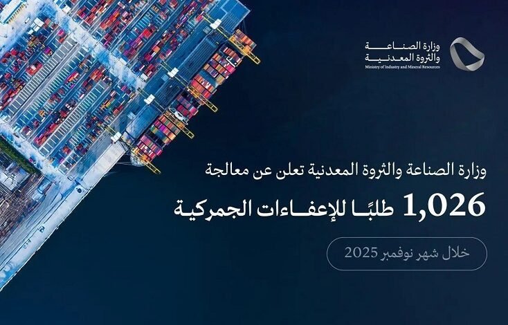 عالجت وزارة الصناعة والثروة المعدنية 1026 طلبًا لخدمة الإعفاء الجمركي الصناعي خلال شهر نوفمبر 2025م، في إطار جهود الوزارة لتشجيع الصناعة المحلية وتعزيز تنافسيتها عالميًّا، عبر منح المنشآت الصناعية الوطنية إعفاءً من الرسوم الجمركية على وارداتها من مدخلات الصناعة.