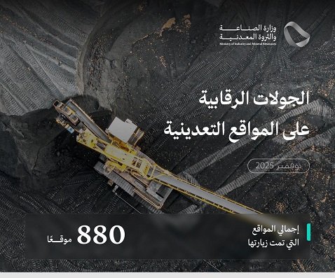 نفذت وزارة الصناعة والثروة المعدنية، ممثلة في وكالة الإشراف على العمليات التعدينية، 880 جولة رقابية على عددٍ من المواقع التعدينية، في مختلف مناطق المملكة خلال شهر نوفمبر 2025.