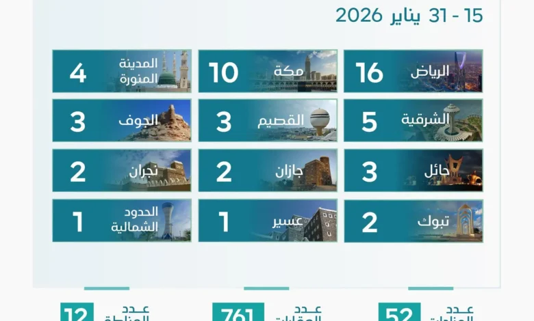 وتتصدر منطقة الرياض قائمة المزادات بواقع (16) مزادًا لبيع (212) عقارًا، تليها منطقة مكة المكرمة بـ(10) مزادات لبيع (227) عقارًا، ثم المدينة المنوّرة بـ(4) مزادات لبيع (44) عقارًا.