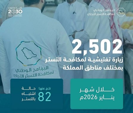 نفَّذ البرنامج الوطني لمكافحة التستر التجاري (2,502) زيارة تفتيشية لمكافحة التستر بمختلف مناطق المملكة خلال شهر يناير 2026م، وذلك استنادًا على الدلالات ومؤشرات الاشتباه بالتستر.