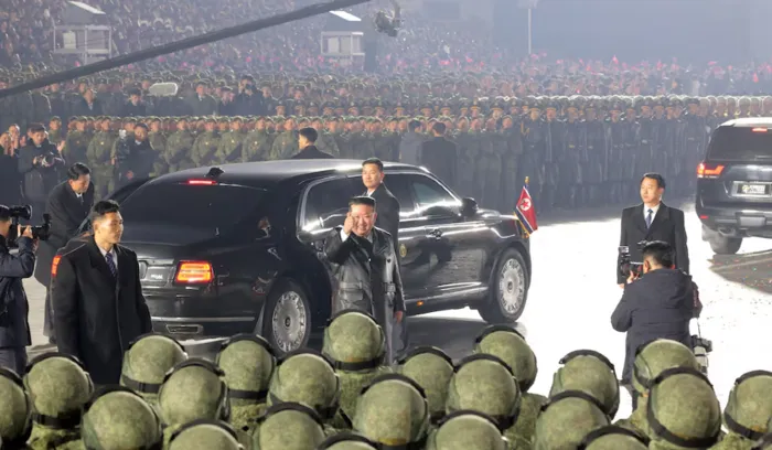 وأظهرت صور نشرتها وسائل الإعلام الرسمية للعرض العسكري تشكيلات من الجنود يسيرون في ساحة كيم إيل سونج المضاءة جيدًا، تحت منصة وقف عليها كيم وابنته مع كبار المسؤولين.