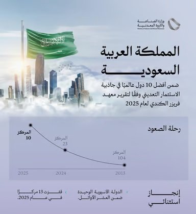 وأظهر التقرير أن المملكة حققت قفزة نوعية بواقع 13 مركزًا وتحسنًا نسبته 14.3% خلال عام واحد فقط، لتصبح الدولة الآسيوية الوحيدة ضمن قائمة الدول العشر الأولى لعام 2025، بعد مسار تحوّل بدأ من المركز 104 في عام 2013، ثم المركز 23 في عام 2024، وصولًا إلى موقعها الحالي كإحدى أكثر الوجهات جاذبية للاستثمارات التعدينية عالميًا.