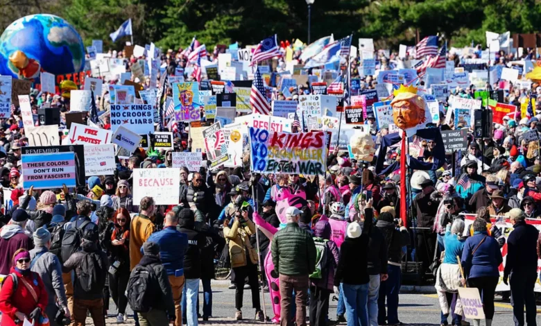 خرج محتجون مناهضون لسياسات الرئيس الأميركي، دونالد ترمب، إلى الشوارع في أنحاء الولايات المتحدة، أمس (السبت)، في إطار أحدث حملات حركة «لا ملوك»، التي يأمل المنظمون أن تصبح أكبر احتجاج سلمي في يوم واحد في تاريخ البلاد.