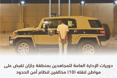 القبض على مواطن بمنطقة جازان لنقله (10) مخالفين لنظام أمن الحدود