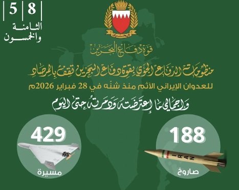 أعلنت القيادة العامة لقوة دفاع البحرين أن منظومات الدفاع الجوي بقوة دفاع البحرين مستمرة في مواجهة موجات تتابعية من الاعتداءات الإيرانية الآثمة، حيث تم منذ بدء الاعتداء الغاشم اعتراض وتدمير 188 صاروخًا و429 طائرة مسيّرة، استهدفت مملكة البحرين.