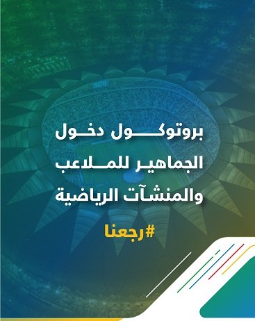 إلحاقًا للقرار الصادر في 29 مارس 2021م، والخاص بحضور الجماهير المحصَّنين للمباريات الرياضية بنسبة 40% من الطاقة الاستيعابية للملاعب، اعتبارًا من تاريخ 5 شوال 1442هـ، الموافق 17 مايو 2021م، بناءً على موافقة الجهات المعنية بمتابعة مستجدات فيروس كورونا المستجد الصادرة في حينه.