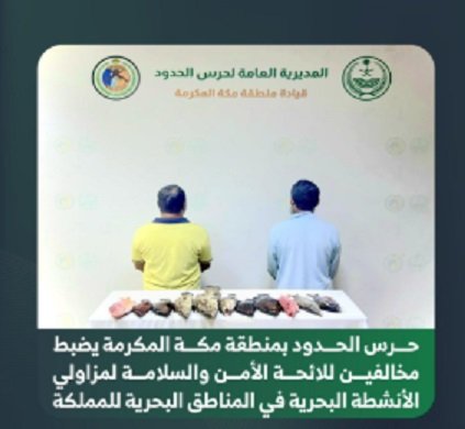 ضبطت الدوريات الساحلية لحرس الحدود في محافظة القنفذة بمنطقة مكة المكرمة مقيمين من الجنسية البنجلاديشية مخالفين للائحة الأمن والسلامة لمزاولي الأنشطة البحرية في المناطق البحرية للمملكة العربية السعودية، وذلك لممارستهما الصيد دون تصريح، وبحوزتهما أسماك مصيدة، واُتخذت الإجراءات النظامية بحقهما بالتنسيق مع الجهات المختصة.