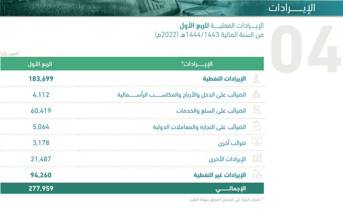 وأفادت أن الإيرادات النفطية بلغت خلال الربع الأول من عام 2022م، 183,699 مليون ريال مسجلةً ارتفاعاً مقارنةً بالربع الأول للعام السابق، والذي بلغ 116,576 مليون ريال، حيث ارتفعت بنسبة 58% مدفوعةً بارتفاع أسعار النفط.