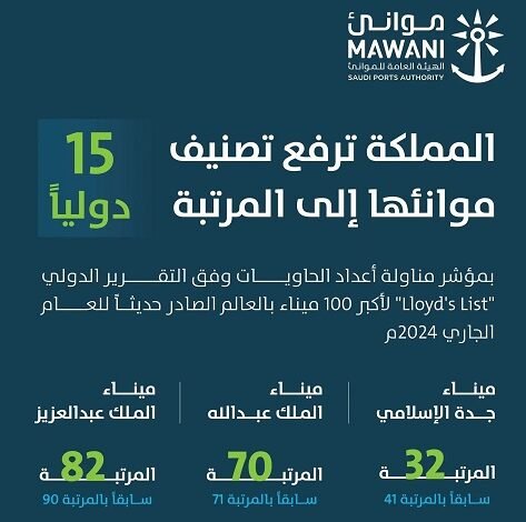 رفعت المملكة ممثلة في موانئها البحرية تصنيفها الدولي في مناولة أعداد الحاويات السنوية متقدمة من المرتبة 16 إلى المرتبة 15 دوليًا وفق تقرير “Lloyd’s List” لأكبر 100 ميناء بالعالم الصادر حديثًا للعام الجاري 2024م.