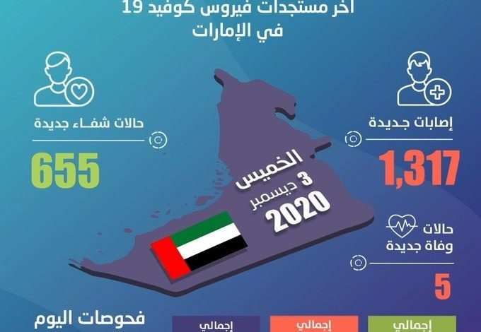 الإمارات تكشف عن 1317 إصابة جديدة بفيروس كورونا و655 حالة شفاء و5 وفيات خلال الساعات الـ 24 الماضية
