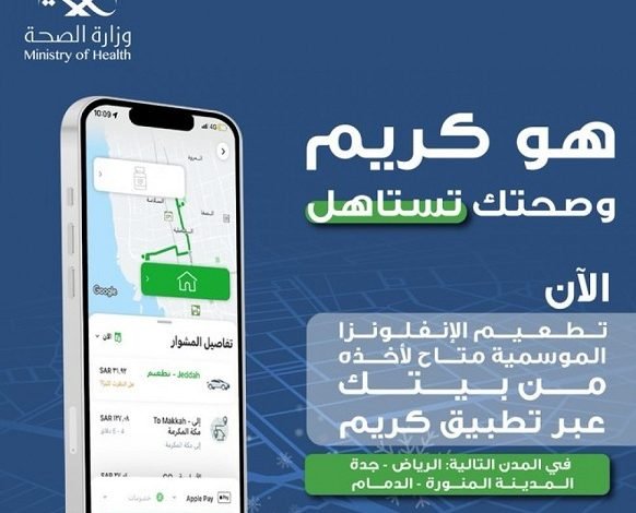 أعلنت وزارة الصحة، عن إتاحة طلب سيارة تطعيم الإنفلونزا الموسمية، لتقديمها للمواطنين والمقيمين في منازلهم، وذلك من خلال تطبيق (كريم) على الهواتف الذكية.