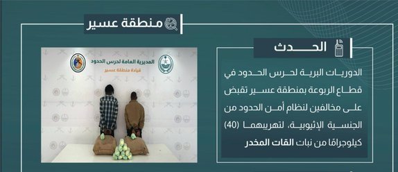 قبضت الدوريات البرية لحرس الحدود في قطاع الربوعة بمنطقة عسير على مخالفين لنظام أمن الحدود من الجنسية الإثيوبية، لتهريبهما (40) كيلوجرامًا من نبات القات المخدر، واستكملت الإجراءات النظامية الأولية بحقهما، وسُلّما والمضبوطات لجهة الاختصاص.