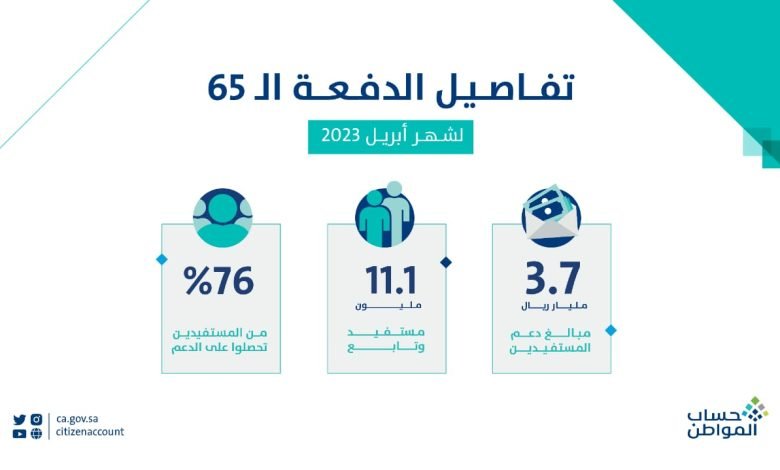 وأوضح مدير عام برنامج “حساب المواطن” أن عدد المستفيدين المستوفين لمعايير الاستحقاق في الدفعة الخامسة والستين بلغ 11.1 مليون مستفيد وتابع، ليصبح إجمالي ما دفعـه البرنامـج للمستفيدين منذ انطلاقته أكثر من 156 مليار ريال، موضحًا أن 76% من إجمالي المستفيدين تحصلوا على الدعم في هذه الدفعة، حيث بلغ متوسط دعم الأسرة الواحدة 1841 ريالاً، فيما بلغ عدد أرباب الأسر 2.1 مليون رب أسرة، بينما بلغ عدد التابعين أكثر من 8.4 ملايين مستفيد، وبلغ عدد المستقلين المستوفين لمعايير الاستحقاق أكثر من 621 ألف مستفيد.