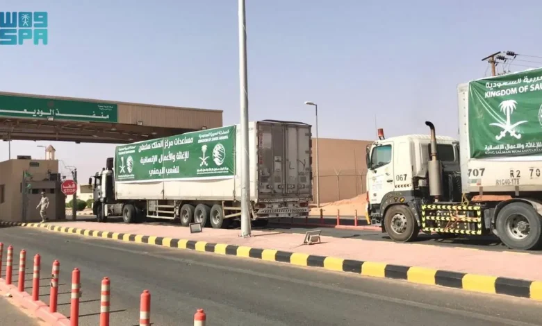 وصول 70 شاحنة مقدمة من مركز الملك سلمان للإغاثة منفذ الوديعة الحدودي في طريقعا إلى اليمن