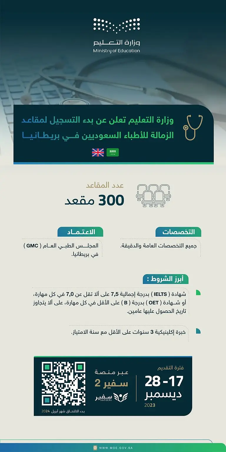 وزارة التعليم : بدء التسجيل على 300 مقعد متاح في الزمالة للأطباء السعوديين بـ بريطانيا